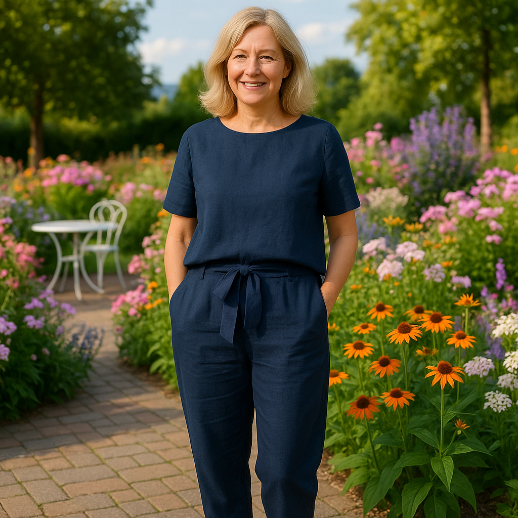This women’s outfit set is designed with a round neck short sleeve top and coordinating ankle-length pants. The top is cut with a straight silhouette and clean hemline. The pants include a gathered waistband with a tie detail, side pockets, and a tapered leg shape for a structured overall outline.