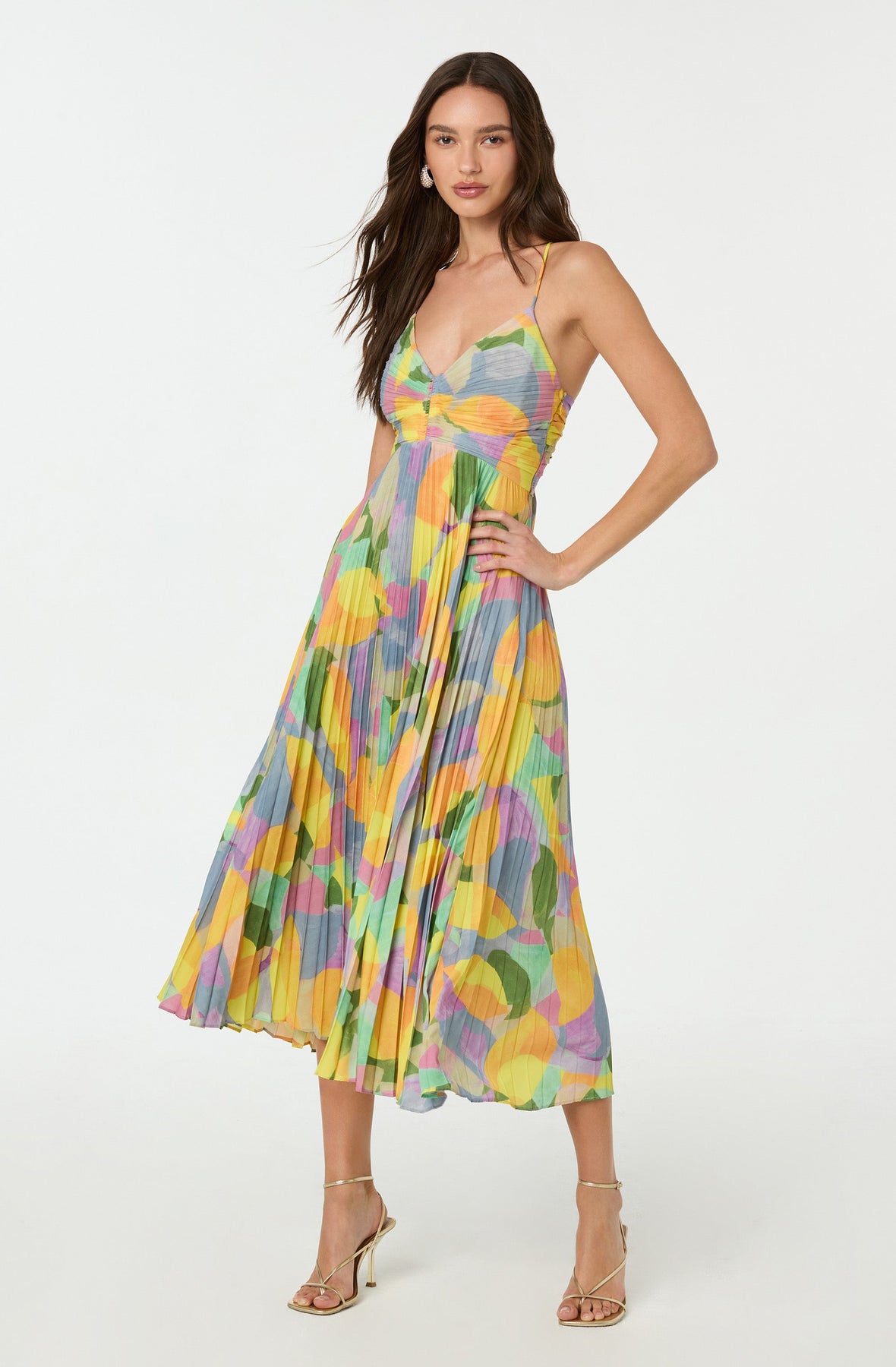This women’s maxi dress features a sleeveless cut with a pleated surface and an abstract all-over pattern. The bodice is shaped with a V-neckline at the front, while the back is finished with a cross tie strap detail that leaves the back open. Designed with a flowing maxi length, the silhouette falls from the waist to the hem. The overall look combines structured pleating with a light, open back design.